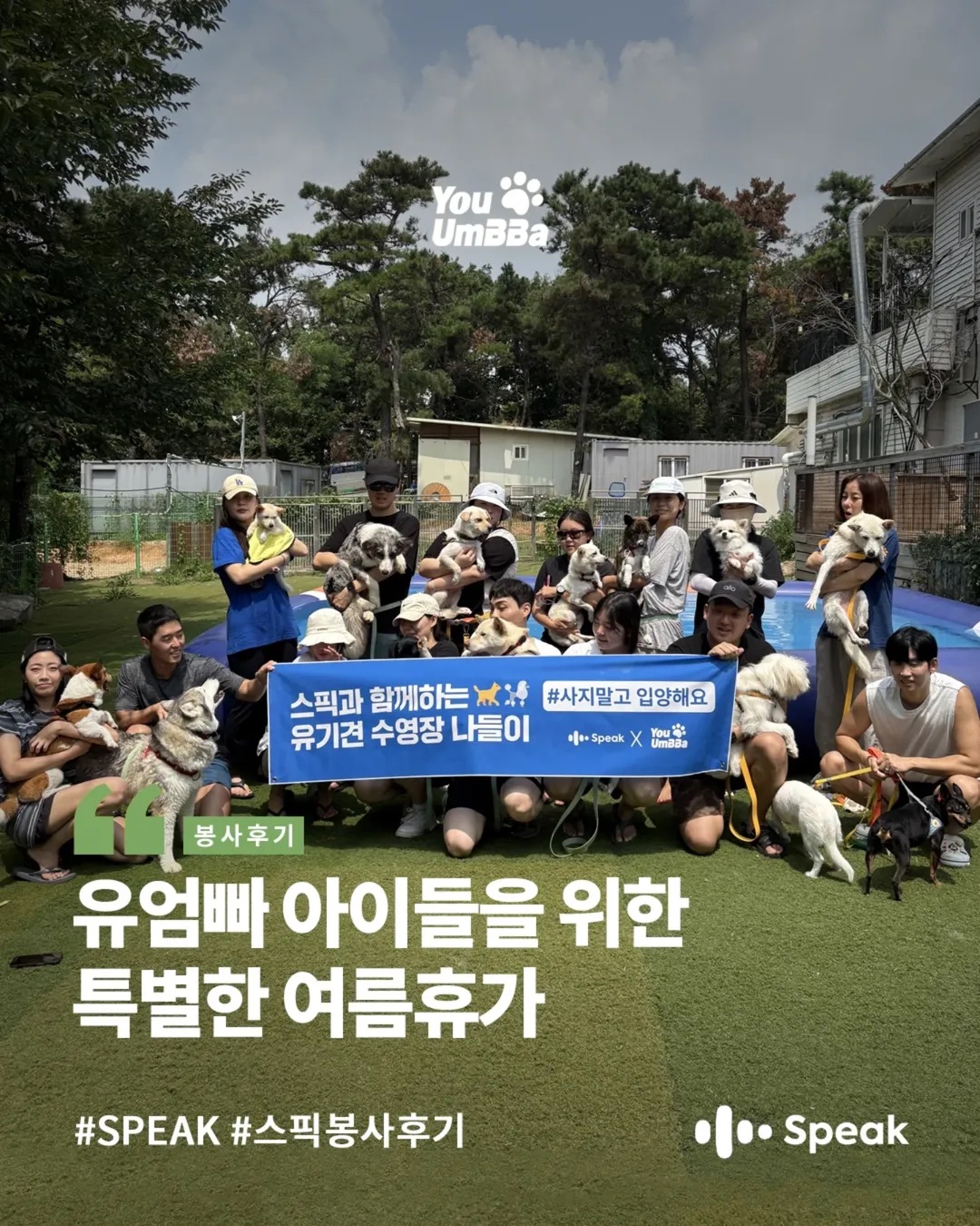 [유엄빠 인스타그램에서 영상과 함께 보기! Click!]아이들만을 위한 통 큰 수영장 대관부터, 직원분들이 한 마리 한 마리 직접 보호자가 되어함께 뛰고, 안고, 웃고, 물놀이까지 전담한 특별한 하루 😊과거의 아픈 기억은 잠시 내려놓고, 엄마 아빠 손 잡고 첫 물놀이 온 반려견들처럼 우리 아이들,오늘만큼은 마음껏 세상을 즐겼어요 🌊💛소심해서 눈도 못 마주치던 아이들도 스픽 팀의 따뜻한 진심에 기적처럼 금세 마음을 열었답니다.보호소 생활 속 숨겨 두었던 물개 본능을 처음 발견하는 모습에는 🦭✨ 얼마나 귀엽고 또 한 편으로는 짠하던지 😭언젠가 입양 가족과 함께 진짜 여름휴가를 떠나는 날이 오면, 오늘을 기억하며 더 당당하고 씩씩하게 놀 수 있겠죠?가족이 없는 아이들의 특별한 하루를 위해 기꺼이 하루를 불태워주신 스픽 팀, 진심으로 감사합니다.스픽은 반려동물과 함께 출근이 가능한, 말 그대로 동물 사랑 철학이 살아있는 회사.직원 모두가 얼마나 사랑이 넘치는 사람들인지, 오늘 하루가 증명해줬어요. 🫶📚 그리고 이 따뜻한 마음을 가진 팀이 만든 앱, 바로 1000만 유저가 선택한 영어 회화 앱 스픽(Speak)!영어도, 사랑도, 그 어떤 말보다 진심으로 전하는 사람들이 있다는 것 — 꼭 기억해주세요.@speak_kr다음 봉사 기대하겠습니다. ^^🎁 유엄빠는 구조견들의 건강과 더 나은 하루를 위해 함께해 주실 기업들을 기다립니다.모든 물품 후원은 '물품 기부금 영수증'발급이 가능하며, 세금 공제 혜택을 받으실 수 있습니다.💌 기업 후원 & 봉사 문의: 이메일 hello@youumbba.org#스픽 #유기견봉사 #소풍데이 #유엄빠