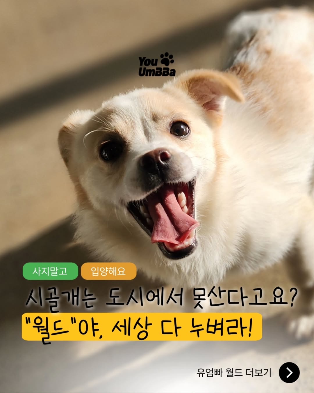 엄마 품을 떠나자마자 좁은 철장에서 판매 대기 견생을 살던 월드는 철장 밖 모든 것이 무서웠지만, 유엄빠에서 두 달이 지난 지금 낯선 봉사자님들과 산책도 잘 하고 간식도 먼저 달라며 사람 무릎에 발을 딛고 올라서는 밝고 사랑스러운 아이로 자라고 있어요.