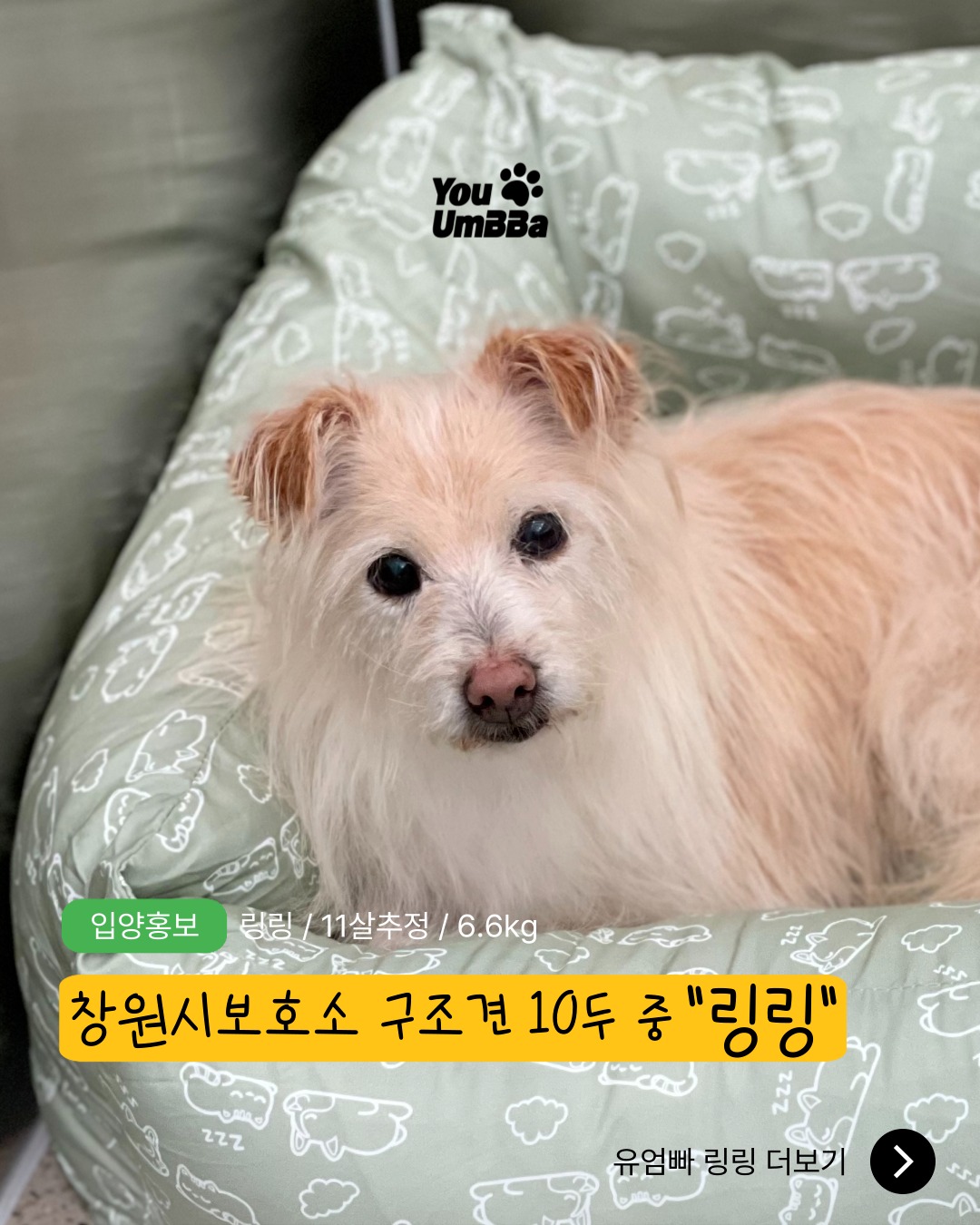 링링이는 지난 5월 집단 안락사 논란의 중심에 있던 창원시 직영 유기견 보호소에서 구조된 10마리 중 하나예요.